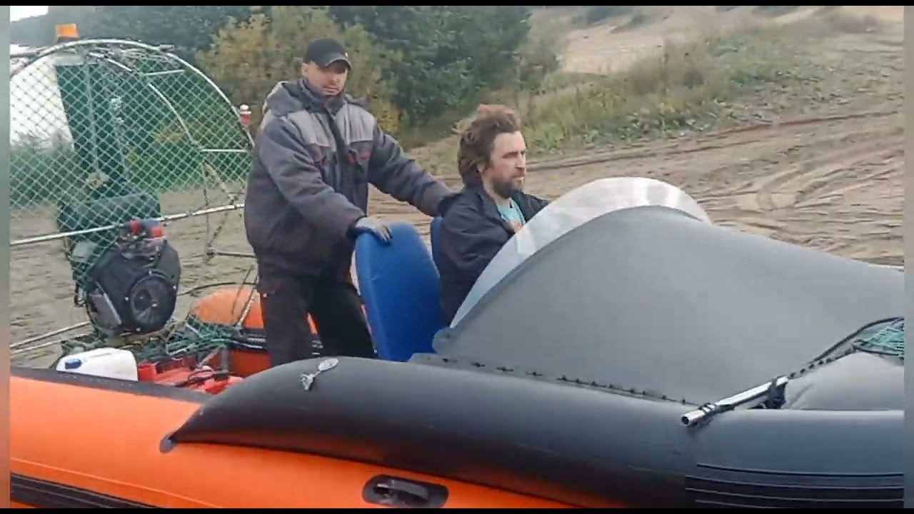 Испытания аэролодки с поддувом. Аэролодка "Скорпион", с поддувом, с вентилируемой чешуёй. Главный двигатель Лончин, двухцилиндровый V-образный четырехтактный, рабочим объёмом 1000см3. Развиваемая мощность при 3600/мин, около 35лс. Нагнетатель "Зонгшен-200", четырехтактный двигатель с вертикальным валом, максимальная мощность 5лс. Днище полностью покрыто чешуей из сверхвысокомолекулярного полиэтилена, толщина чешуи 2мм. Воздух от нагнетателя подаётся через воздуховоды в пространство под чешую, и обеспечивает воздушную подушку под днищем, при отсутствии гибкого ограждения. В отличии от большинства других аэролодок с поддувом, корпус аэролодки Скорпион сразу проектировался для использования поддува. Обсуждение на форуме "Катера и яхты": https://forum.katera.ru/index.php?/topic/63438-aerolodka-s-podduvom/?p=4398047781462