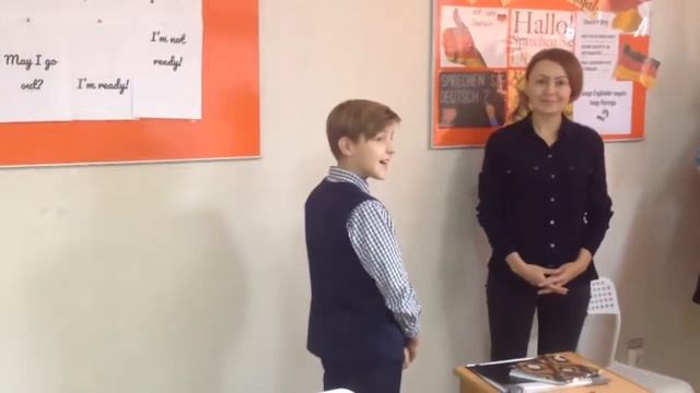 В этом отрывке мы в процессе разучивания диалога о Веронике Вентуре. Студенты работают в парах с опорой на визуальный ряд в виде символов. Студенты учатся задавать вопросы и предоставлять по запросу информацию личного характера, например: -Sind Sie verheiratet? - Nein, ich bin geschieden. - Haben Sie Kinder? - Ja, ein Kind. -Wie alt ist Ihr Kind? - Drei.