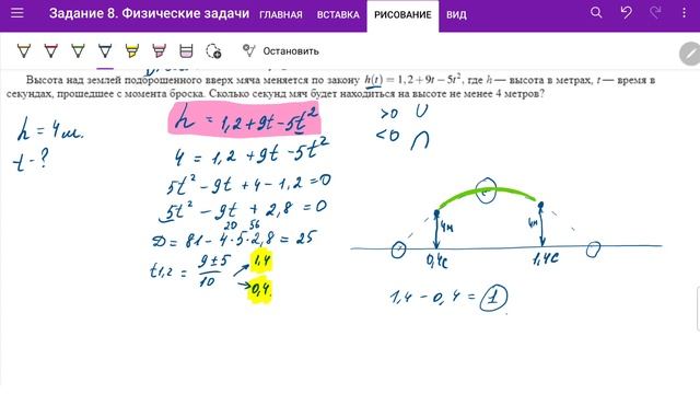 ТГ-канал: t.me/ege_oge_maths. Вся теория и практика для ПРОФИЛЬного ЕГЭ: https://stepik.org/a/123457. Много задач для самостоятельного решения с моментальной проверкой результата! Разбираем задачу из профильной математики с формулами. В этом видео разбираем квадратную формулу, решаем задачи: 1. Высота над землёй подброшенного вверх мяча меняется по закону ℎ(𝑡)=1,2+9𝑡-5𝑡^2, где ℎ — высота в метрах, 𝑡 — время в секундах, прошедшее с момента броска. Сколько секунд мяч будет находиться на высоте не менее 4 метров? 2. Для нагревательного элемента некоторого прибора экспериментально была получена зависимость температуры (в кельвинах) от времени работы: 𝑇(𝑡)=𝑇0+𝑏𝑡+𝑎𝑡^2, где 𝑡 — время в минутах, 𝑇0=1400 K, a=−10 K/мин2, b=200 K/мин. Известно, что при температуре нагревателя свыше 1760 K прибор может испортиться, поэтому его нужно отключить. Определите, через какое наибольшее время после начала работы нужно отключить прибор. Ответ выразите в минутах.