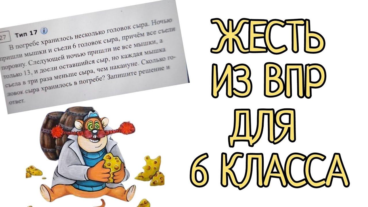 Мой канал ВК — https://vk.com/yellow.school В погребе хранилось несколько головок сыра. Ночью пришли мышки и съели шесть головок сыра, причём все съели поровну. Следующей ночью пришли не все мышки, а только 13, и доели оставшийся сыр, но каждая мышка съела в три раза меньше сыра, чем на конуне. Сколько головок сыра хранилось в погребе?