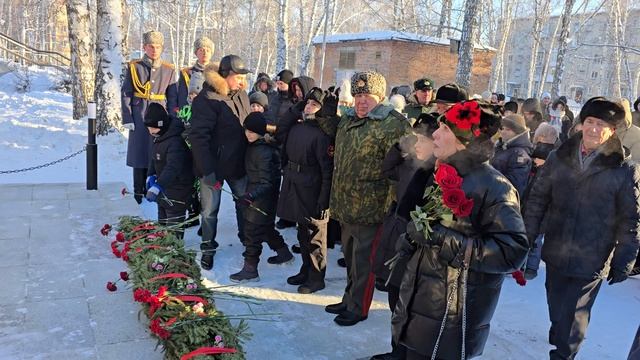 Церемония открытия бюста дважды Героя России Михаила Гудкова на территории лицея №81 в Новосибирске, в котором он учился с 1989 по 2000 год. Лицею было присвоено имя заместителя главкома ВМФ России, генерал-майора Михаила Гудкова, который погиб 2 июля 2025 в Курской области в зоне проведения СВО. / 9 декабря 2025 г./ Погода: -30 градусов по Цельсию / Участие председателя Новосибирской областной организации ветеранов Панарина Владимира Ивановича в мероприятии / Возложение цветов